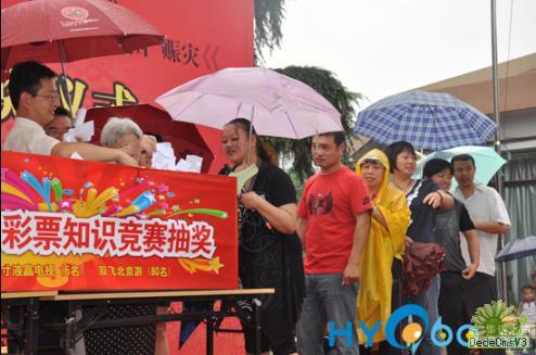 上午8:40分,华语之声福彩主持若尘赶到活动现场。连夜的细雨依然未有放晴的意思,可是在细雨下,远远就看到采荷社区文体中心广场人挨着人、伞挨着伞,活动尚未开始,大家已经被现场写有“浙江省“双色球”彩票知识竞赛抽奖仪式暨杭州市“福彩走进社区”公益活动”的主题吸引过来,再看对面的“刮刮乐”宣传展位,早已被早早赶到的市民朋友挤了个水泄不通,四千多份宣传单在大家的热情中很快就被派发一空。尽管雨越下越大,但是大家的目光都聚焦在桌上色彩明亮,画面别致的“刮刮乐”彩票上,有的边看边问,有的兴趣正浓的刮着笑着,观看的、咨询的、刮奖的,场面十分火爆,为了助兴,此次活动还特邀了社区腰鼓队进行文艺表演,尽管大雨天没有办法在广场上舞动助兴,但是在旁边的避雨区,腰鼓队们也依然在热情的敲打着,现场呈现一片喜乐融融的景象。