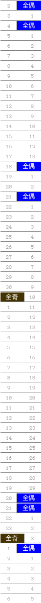 常规走势图 | 奇偶走势 | 大小走势 | 质合走势 | 和(合)值走势 | 012路走势 | 新规则走势 | 试机号合并走势图 | 隔期走势