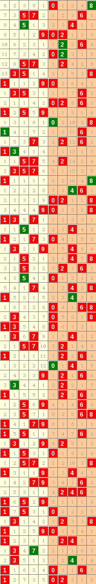 隔10期尾8走势=>常规走势 | 奇偶走势 | 大小走势 | 质合走势 | 和(合)值走势 | 012路走势